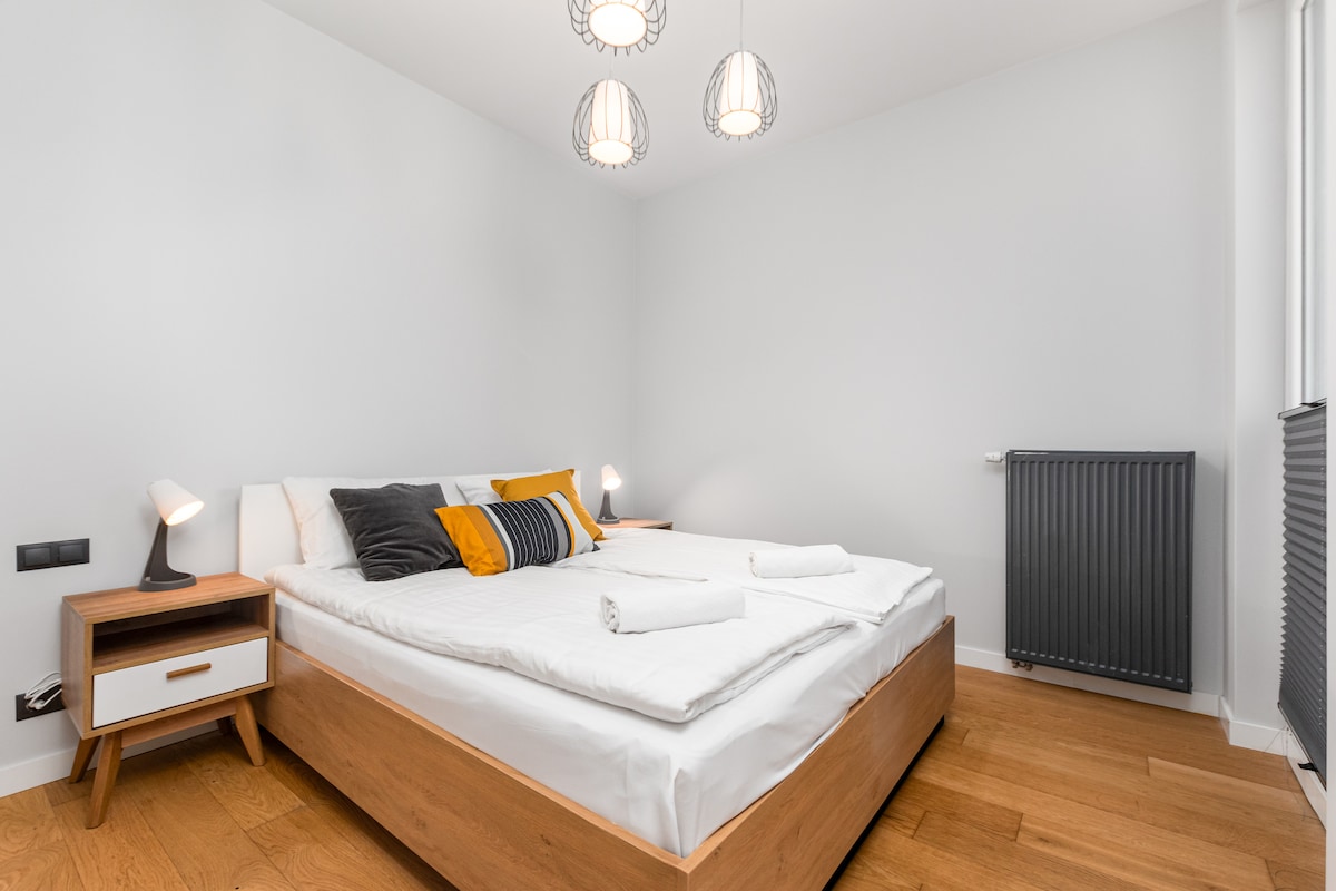 Bekväm, fullt utrustad lägenhet i en ny byggnad. Ett vardagsrum med ett öppet kök uppdelat i en matsal och en vardagsrumsdel. Sovrummet har en dubbelsäng och en rymlig garderob. Det finns också en klädkammare som ett extra förvaringsutrymme. Det finns butiker, restauranger och kaféer i området Utrustning: luftkonditionering, kaffebryggare, vattenkokare, strykjärn, strykbräda, tvättmaskin Vägbeskrivning från Chopin Airport 20 min taxi 50 minuters kommunikation från Modlin Airport 50 min taxi 120 min kommunikation