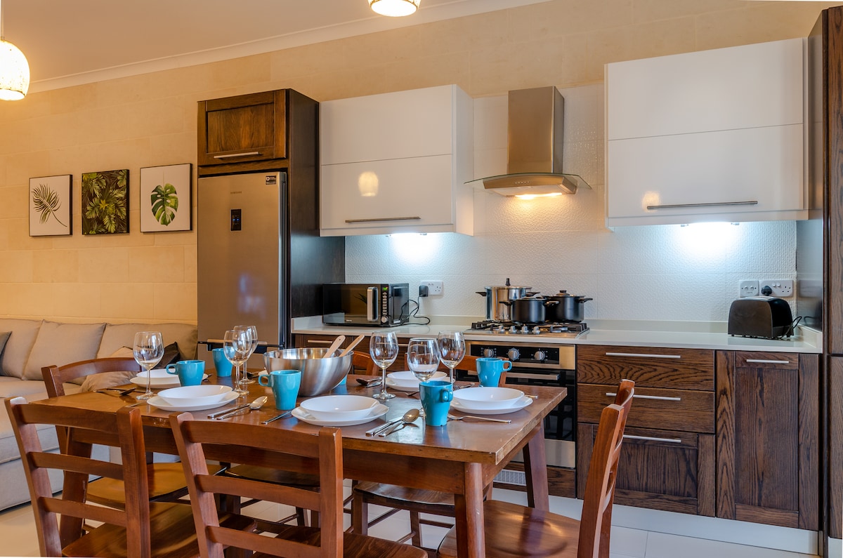 En stor solbelyst lägenhet i Nadur centrum. Lätt att nå med buss från Ferry Terminal. Kaféer, restauranger, bageri + livsmedelsbutiker i närheten. Härligt kök utrustat med kaffe, te, olja och mycket mer. Badrummet har badkar/dusch + gratis användning av tvättmaskin. Balkong framtill och terrass baktill. Gasvärmare och avfuktare som hjälper till att stabilisera luften. Ny bekväm madrass för en god natts sömn. Vacker panoramautsikt över öarna runt hörnet. Bästa värde lägenhet på ön!