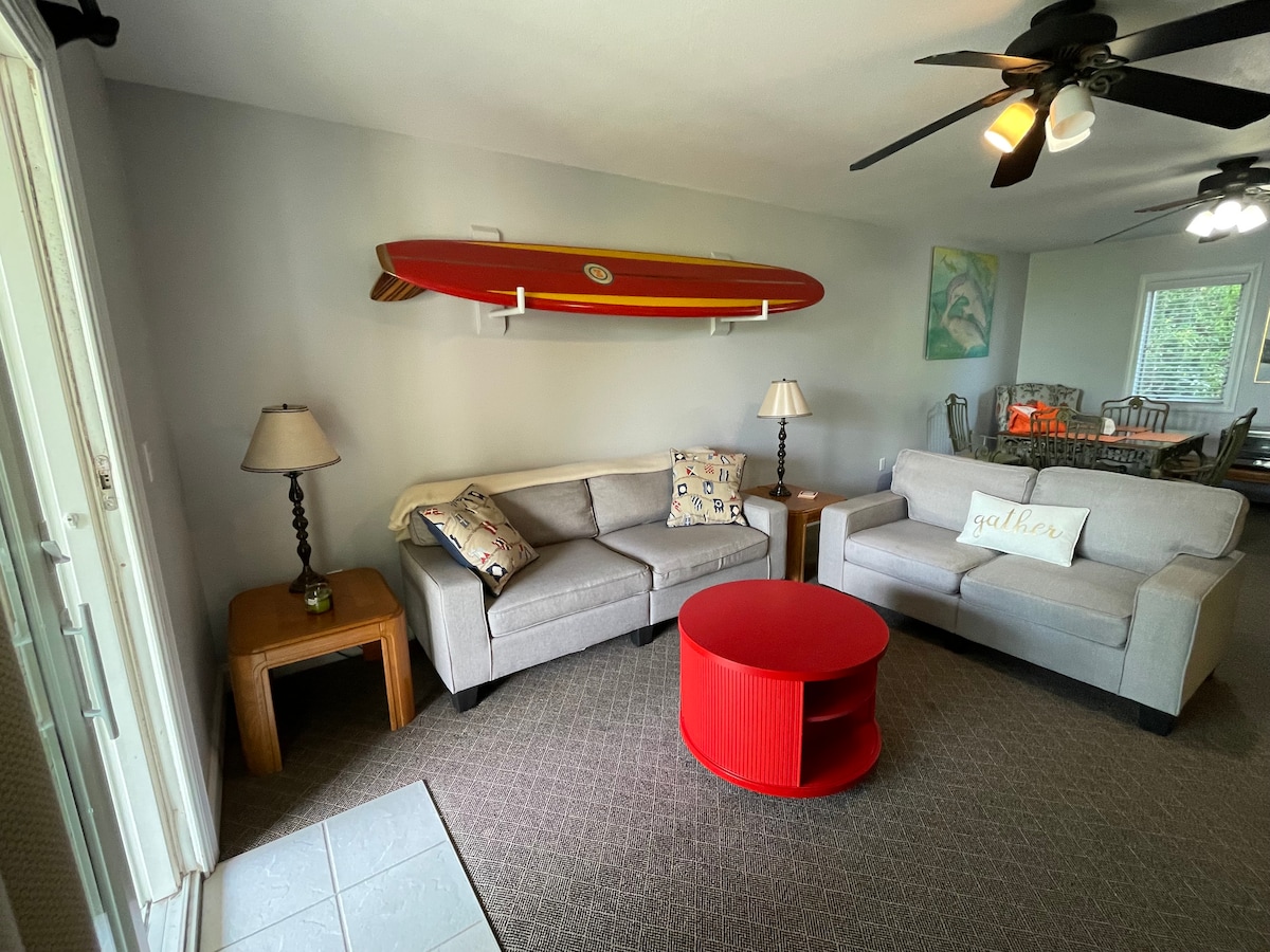 Välkommen till din OBX Retreat Suite! Nytt och modernt utrymme med eget sovrum, badrum och walk in garderob. Superbekväm queen-säng, soffa, 50 tums tv, minikylskåp och kaffe förstås. Snabbt WiFi, gratis enkel parkering, utomhus lounging utrymme med picknickbord och grill. Centralt beläget till allt i OBX. Gång- och cykelavstånd till restauranger och shopping. Fri tillgång till bekväma strandstolar, kylväska, paraply, fiskespö och vikter för lite motion. Trevlig utedusch också!