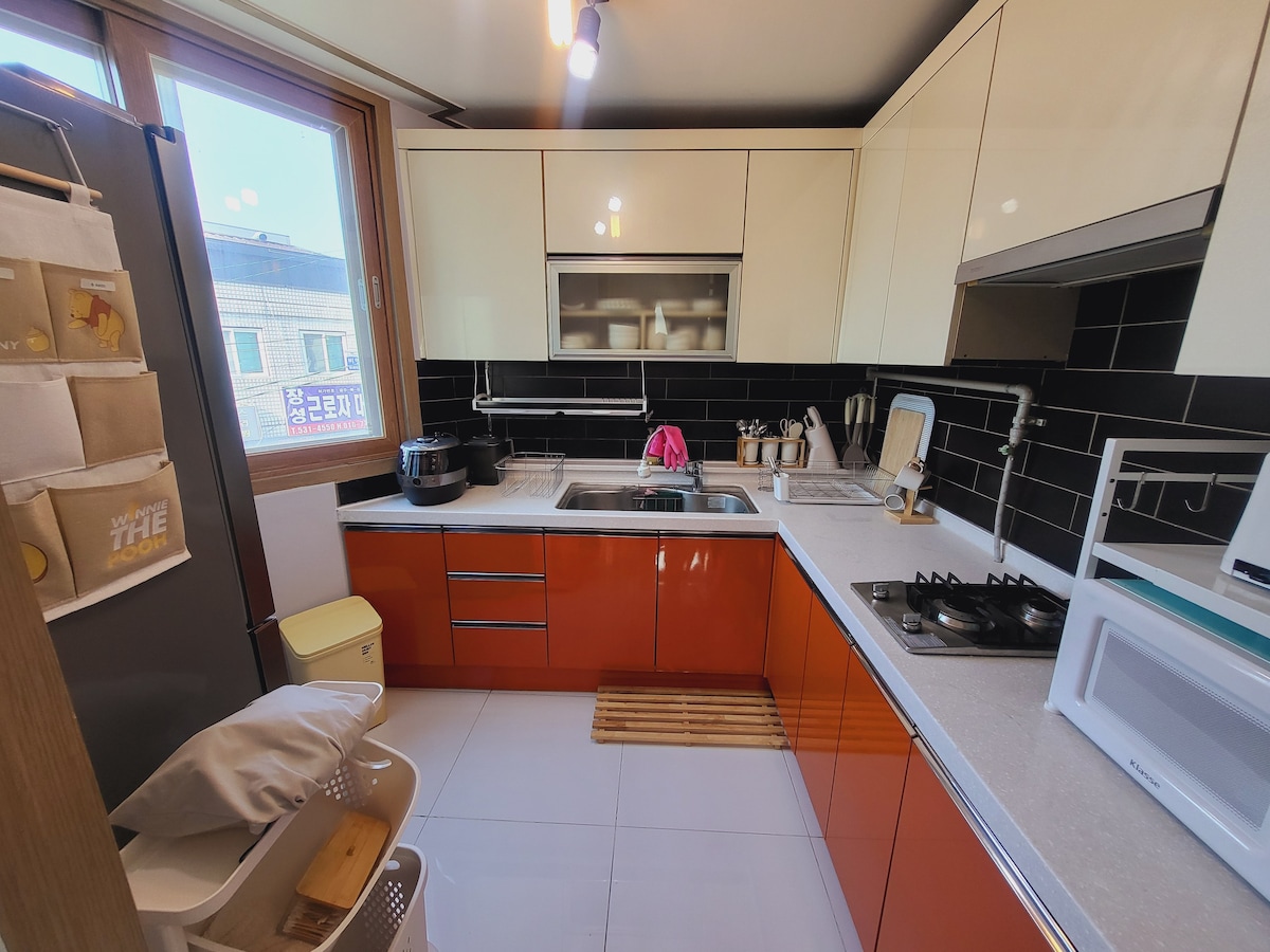 Borimadang: Sömn ligger i Borimadang, en representativ gränd i Mokpo, och det finns ett modernt historiskt kontor, Yeonhee Super, Shihwa Village och Daebandong i närheten, och det finns många restauranger och kaféer, så det är ett bra ställe att koppla av. Det är ett privat hus på andra våningen, och takterrassen där du kan grilla är för privat bruk (belysningen är så vacker) * Observera innan du bokar * (Boende) 2 superenkelsängar, wifi, tv, terrass framför boendet 2 personer Daglig tvätt och byte av sängkläder * Ingen mellanrengöring vid flera nätter i följd.Byte av sängkläder (möjligt på begäran av gäst - extra avgift) (Badrum) Tandkräm, skumrengöring, schampo, balsam, duschtvål, handtvål, handduk (gott om), hårtork (Kök) Induktion, mikrovågsugn, kylskåp (flaskvatten), vattenkokare (kanekaffe, grönt te), gryta, stekpanna, skål, tallrik, köksredskap Engångsprodukter används för disktrasor och skurborstar för renlighet. Tvättmaskin, torktumlare Vi kommer att sträva efter att göra det till ett behagligt och bekvämt boende