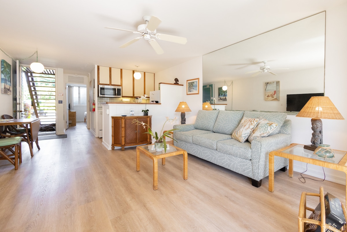 Hörnenheten har alla ena sidan lamellfönster! King Bed, tvättmaskin/torktumlare. Alla grundläggande bekvämligheter inklusive strandhanddukar/stolar/kylbox. Nya apparater och höga lanai sittplatser för att se över skenorna! Gratis WIFI, parkering på plats och grundläggande kabel-TV. Ny luftkonditionering i vardagsrummet. Kaleialoha #204 Närmaste lägenheten till stranden! Ombyggt kök med rostfria vitvaror, kvartsbänkskivor och keramisk spis. Renoverat badrum med dusch. Luftkonditionering I VARDAGSRUMMET! King Bed med alla nya Bali-inspirerade möbler.