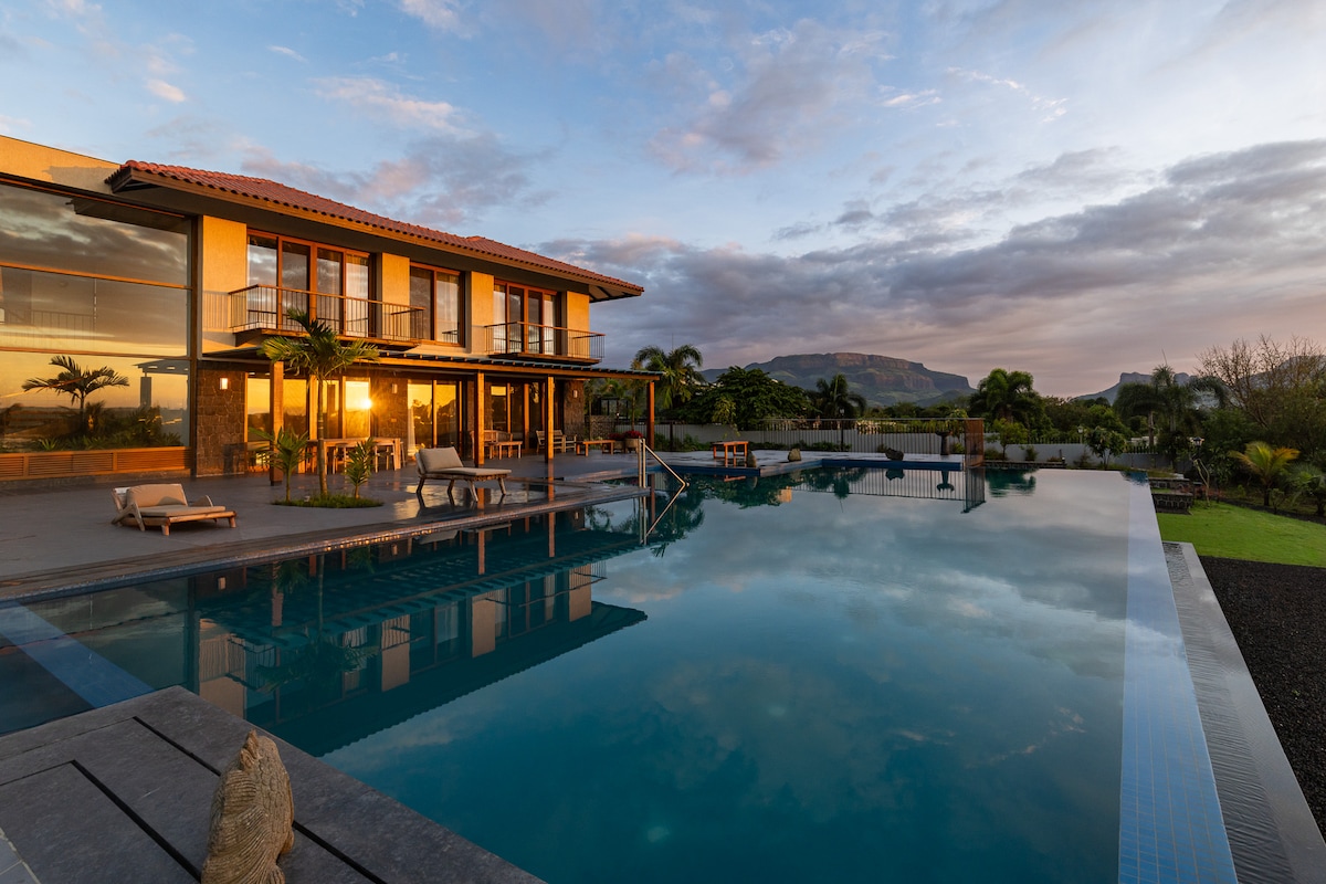 Perched in the serene Western Ghats, this 4-BHK villa with a stunning outdoor patio offers a peaceful hillside retreat amid lush greenery and hill views.Just 15 minutes from Trimbakeshwar Temple and 45 minutes from Sula Vineyards, it features four elegant bedrooms, two living areas & a dining space.Guests can unwind by the pool, indulge in spa treatments, practice yoga, savor delights at the restaurant, or relax in the gardens, all while immersing in nature & the timeless serenity of the hills.