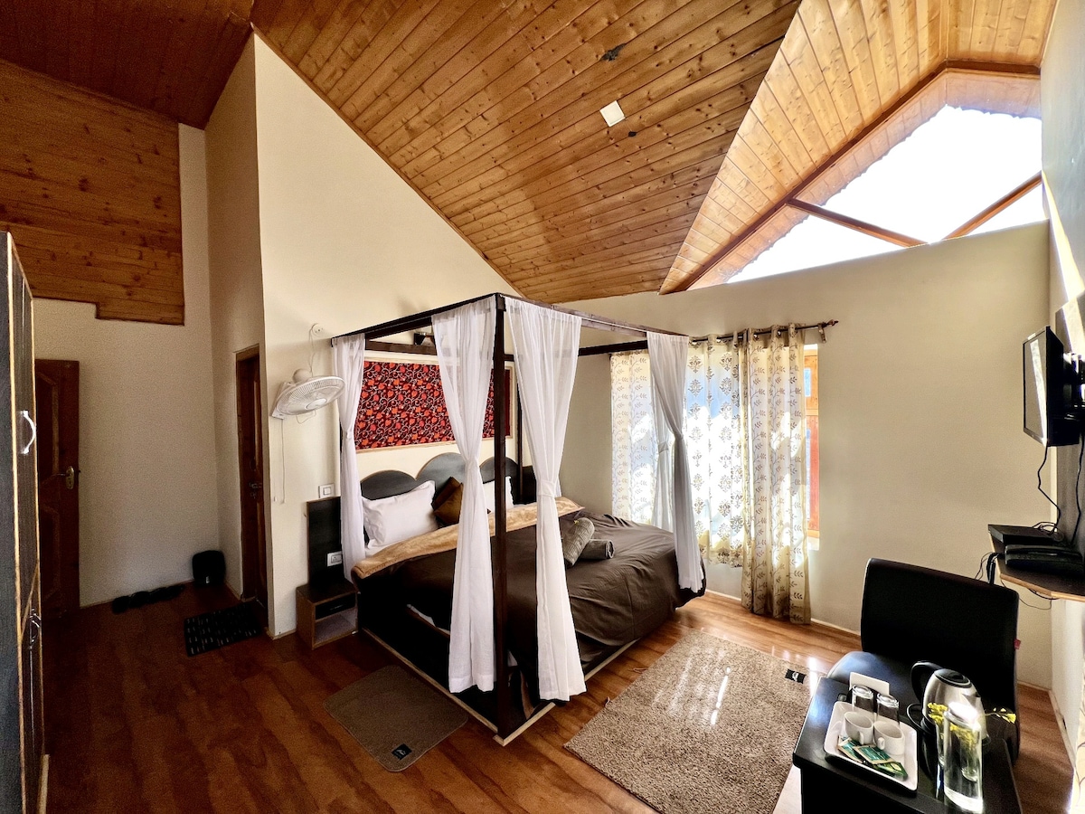 its a wooden attic family room with 2 double beds its near hadimba temple and 2.5km from mall road manali