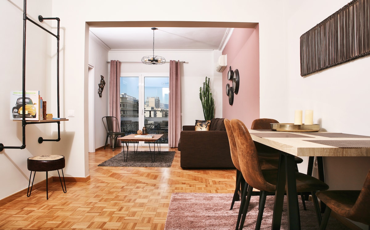 Ljus, solig, rymlig, modern, takvåning med stor balkong och fantastisk utsikt precis bakom National Archaeological Museum. Med stora och bekväma utrymmen kan den enkelt rymma upp till 5 personer. Den är utrustad med alla nödvändiga apparater för att bo som om det var ditt eget boende. Beläget i det mest livliga och bohemiska området i Aten och bara 6 minuter från tunnelbanestationen. Känn lyxen i den moderna designen och njut av utsikten medan du är i centrum av staden.