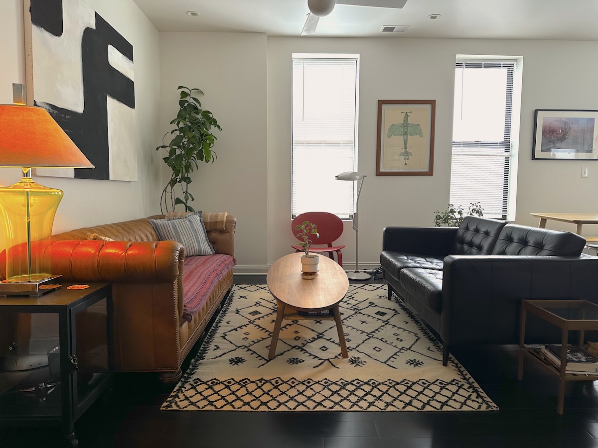 This bright, art-filled 2BR retreat boasts soaring ceilings, large windows and skylights that flood the space with natural sunlight. Colorful décor reflects Pilsen’s vibrant artistic energy. Cook in the fully equipped kitchen or explore nearby restaurants, cafés, and galleries. Just a few blocks from the Damen Pink Line, you’re perfectly positioned to enjoy the neighborhood’s murals, music and culture, while relaxing in a stylish, cozy and modern space.