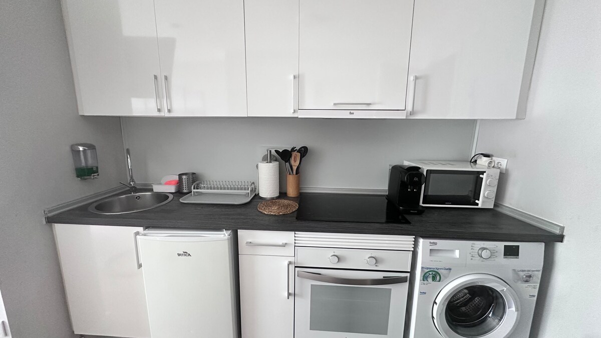 Det är perfekt för ett par eller ett par med ett eller två barn. Vi rekommenderar inte för två par eller 4 vuxna eftersom sängen och bäddsoffan är i samma rum! För gäster utan eller dåliga omdömen krävs en deposition på 200 euro vid ankomst för att returneras vid utcheckning om ingen skada har gjorts. Ganska, autentiskt spanskt grannskap med barer och restauranger för att prova lokala rätter, tapas och paellas. Apotek, stormarknad, buss, tunnelbana och stadscykel alla inom 5 minuters promenad.