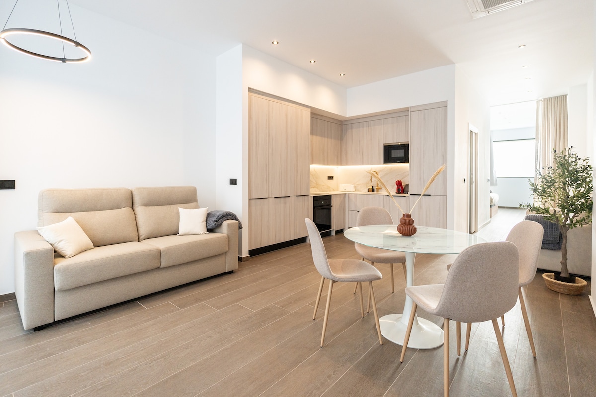 Snygg nordisk design möter varmt spanskt boende i detta boende där djärva färger framhäver den moderna inredningen. Koppla av i de lugna öppna utrymmena eller loungen på den soliga balkongen med utsikt över gatorna. Du kan njuta av ett uppfriskande ögonblick i det rymliga badrummet eller förbereda dig en underbar måltid med det fullt utrustade och möblerade köket. Och när du är trött på din utforskande dag i staden, inget bättre än lugnet i sovrummet och den bekväma sängen.