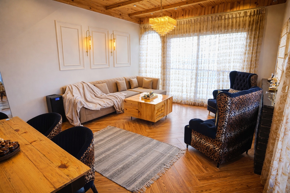 Jannat är en själfull hyllning till Himalayas natur. Detta eleganta hem är tillverkat i tidlös sten och trä och ligger på en 1 hektar stor egendom med terrasserade trädgårdar som blommar med Aquilegias, Clematis, Peonies, Delphiniums, Digitalis, Wisteria, Rudbeckia och 200 utsökta David Austin Old English Roses. Samlas med nära och kära runt de sprakande öppna spisarna inomhus eller en öppen eld utomhus. Oavsett om du dricker chai i rosenträdgården eller tittar på snön falla på vintern, hittar du en liten bit av "Jannat" här