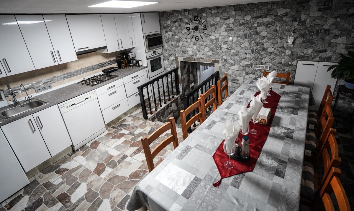 Traditionellt hus beläget i den urbana kärnan. Den har på bottenvåningen i rymligt vardagsrum med öppen spis och TV med DVD Hemmabio och filmer, matkök och badrum. På bottenvåningen 4 dubbelrum ingår, rustik dekor. Gemensam sten kakel uteplats med andra gäster, med liten gräsyta, möblerad täckt veranda,grill . Pinnar, bollar, och bollar att leka på byns framsida 20 meter från huset. Vi tillåter husdjur med en extra avgift.