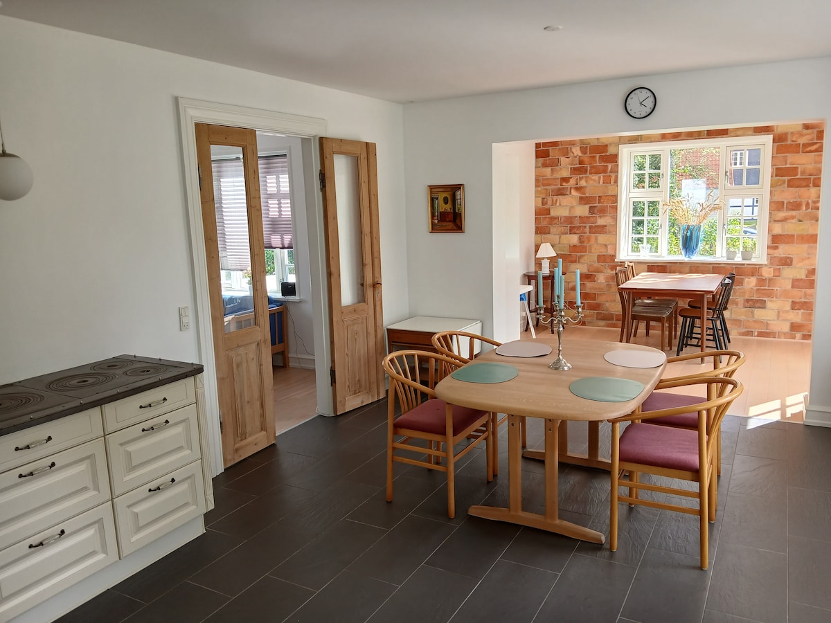 Minimum 2 overnatninger - minimum 2 nights. Super beliggenhed i kort afstand til centrum, med spisesteder, cafeer og museer. Parkering lige ved døren samt supermarked, bager og tank-station. Der er egen terrasse med havemøbler - både overdækket og til sol, grill og bålsted. Alt er ny renoveret. Bemærk: Linnedpakker kr. 50,-/pr.person (bestående af sengelinned, 4 håndklæder, bademåtte, viskestykker mv.) obligatorisk. Boligen er ikke egnet til børn eller gangbesværede personer.