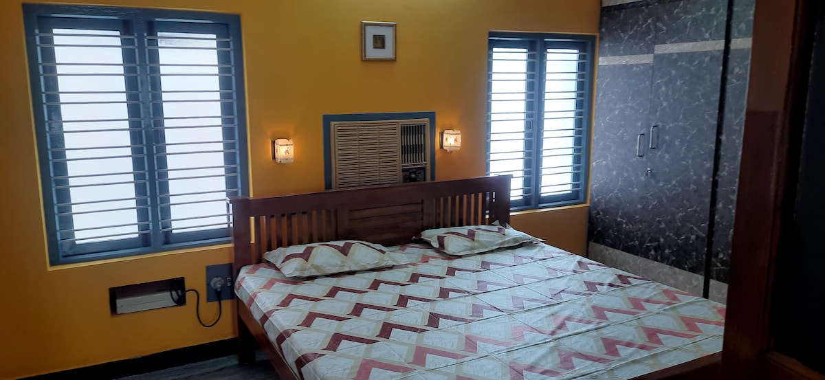 Inte bara en vistelse – känn dig som hemma i Kumbakonam! 🌿 Njut av en mysig hemvist nära Kumbakonams berömda tempel med AC, Wi-Fi, kök, säker parkering och en privat balkong. Sovrummet har en king-size säng för 2 vuxna och 1 barn. Extra madrass finns tillgänglig på begäran mot en extra kostnad, som betalas vid hemvistelsen. Badrummet inkluderar både indiska och västerländska toaletter. Tempelbesök, hämtning/avlämning och sightseeing kan ordnas.