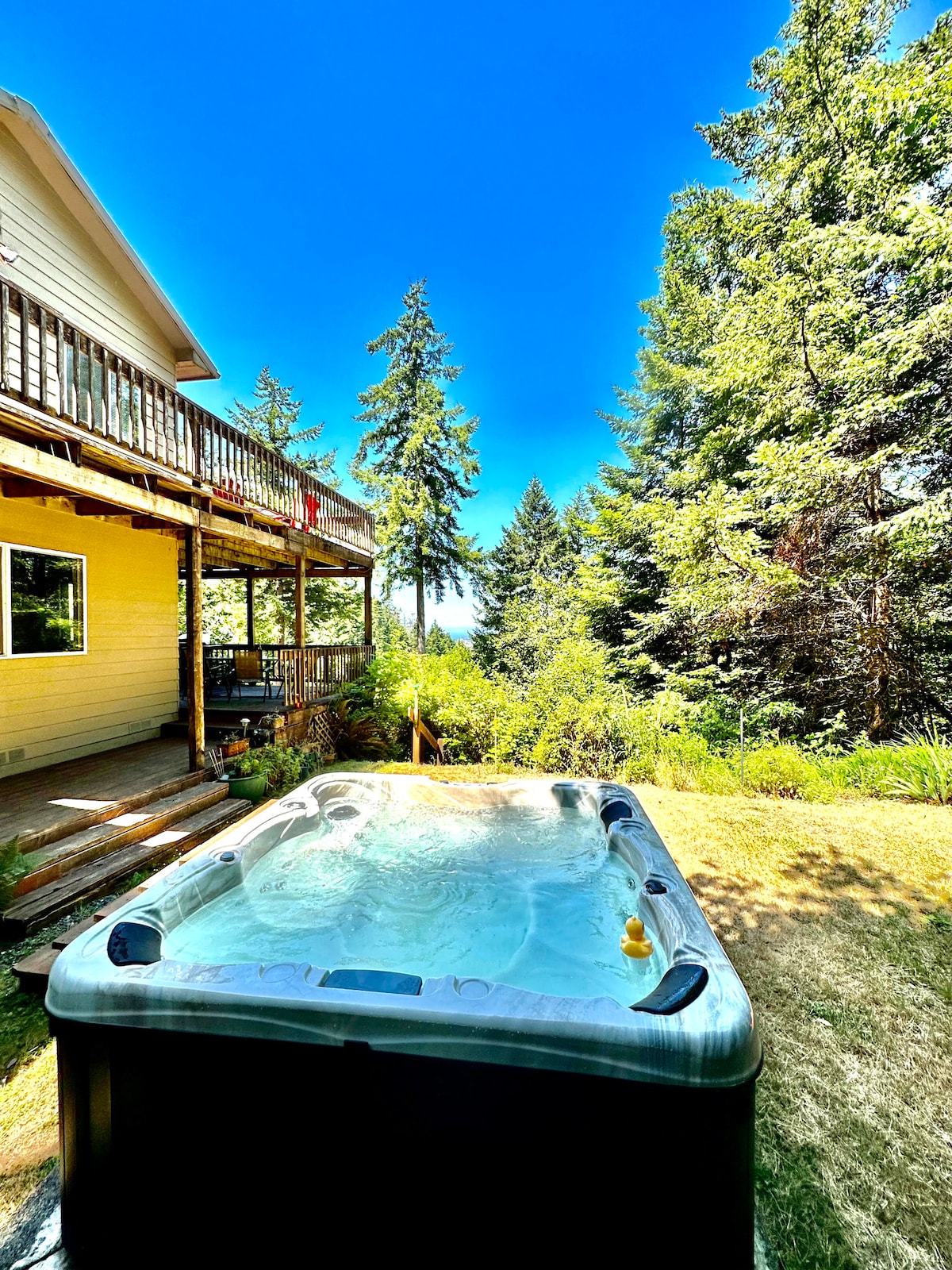 Enjoy the 𝘎𝘖𝘓𝘋𝘌𝘕𝘝𝘐𝘌𝘞 from this luxe rental - only 0.5 mile to the beach. Take in beautiful ocean views & amazing sunsets from the patio, which has a 6 person HOT TUB The perfect coastal retreat for hiking, fishing, kayaking - and so much more! Home features a smart TV, electric fireplace, fully stocked kitchen with stainless steel appliances. VERY family friendly - Pack 'n Play, High Chair, Toys, etc. Our 5 star reviews say it all! Due to allergies, we cannot currently host animals
