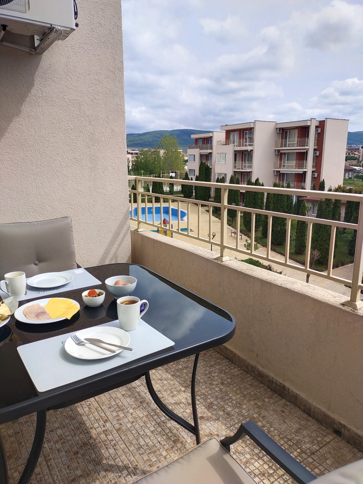 Boenden finns tillgängliga i en månad eller mer. Sveti Vlas. New Sorrento Sole Mare-komplex med ett vackert område, pool och lekplats. Ny lägenhet, utrustad med alla möbler och apparater för bekvämt boende. Dubbelsäng 160*200 Garderob, matbord, hårtork, strykbräda och strykjärn, tallrikar etc. Stor balkong med stolar och bord. Havet ligger 5-7 minuters promenad bort. Butiken ligger 3 minuter bort. Restauranger, kaféer, gym, apotek ligger inom gångavstånd.