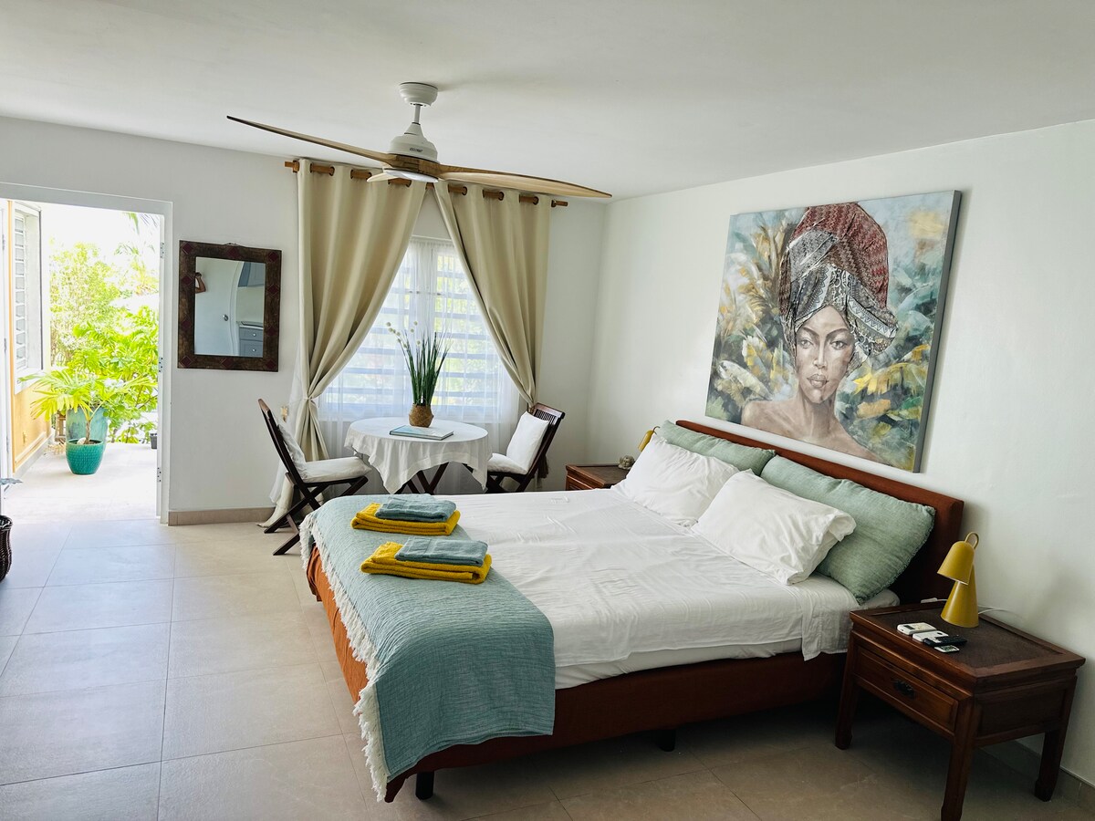 Fly till denna eleganta, centralt belägna gästsvit på nästan en hektar tropisk mark med viskande palmer och fruktträd. Denna nyrenoverade studio har ett fullt utrustat kök (med jerk-krydda!) och en lugn delad uteplats med grillplats. Andas in den karibiska brisen, koppla av under stjärnorna och njut av vår 420-vänliga fastighet – bara ingen rökning inomhus, tack. Perfekt för par, ensamma resenärer eller alla som söker lugn, komfort och en autentisk övibb.