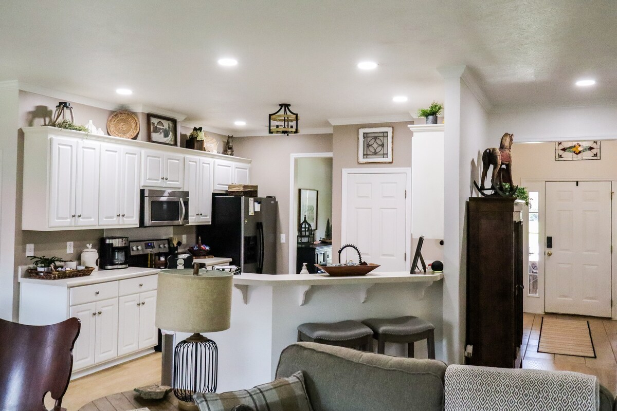 Kom och koppla av i denna mysiga stuga i New Ellenton, SC! Beläget lika långt mellan Aiken och Augusta, oavsett om du är i stan för hästar eller för golf, kan du njuta av din lediga tid i detta nyrenoverade utrymme. Alla möbler är helt nya från och med januari 2024! Den integritetsinhägnade bakgården med pergola och trädgårdsutrymme är en höjdpunkt, och höghastighetsinternet säkerställer din förmåga att arbeta hemifrån och videoströmma. En Tesla Universal-laddare låter dig ladda upp din elbil under din vistelse.