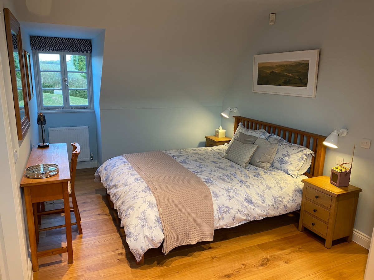 Coach House lägenheten är nybyggd, fristående med ett fullt utrustat kök, vackert inrett badrum, dubbelrum och dubbelsäng på galleried mezzaninvåningen med välvt tak som skapar en loftstil. Den är fullt uppvärmd, har fiberoptisk wi-fi, streamad TV och en Sonos-högtalare för musik — du behöver appen! Utrymmet är modernt, ljust men ändå mysigt. Utomhus ligger det i en innergård av byggnader på 14 hektar mark. Det finns en egen ingång och parkering på plats.