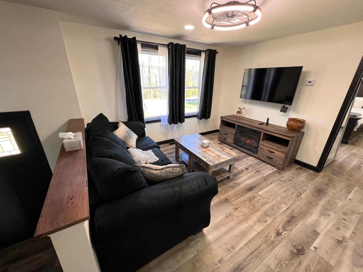 Mysig stuga vid en privat väg. Stor altan med utemöbler och grill i full storlek med propan, perfekt för dina sommarmokor! Kabel, WIFI och smart HDTV. 2 rymliga sovrum. Separat värme och A/C! Matbord med fullt utrustat kök; inklusive full storlek ugn, kylskåp, kaffebryggare, restauranger och köksredskap. Stort allrum med ny matta, bekväm bäddsoffa och kabel HDTV. Gästerna kommer att ha tillgång till hela huset; inklusive uteplats och trädgård.