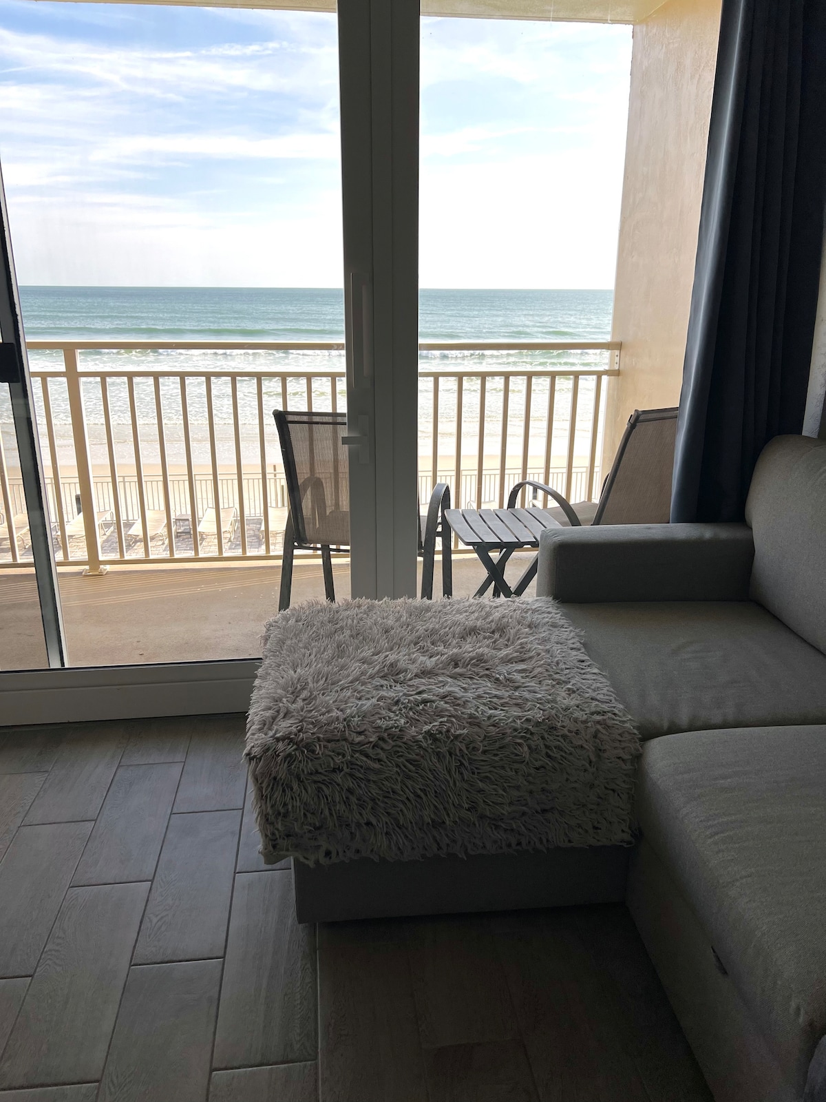 Vi finns på Daytona Beach en 1 minuts promenad genom poolområdet för att vara på stranden POOLEN ÄR ÖPPEN OCH INOMHUSPOOLEN ÄR ÖPPEN Luta dig tillbaka och slappna av i vårt nyrenoverade lugna och eleganta utrymme. vi har ett kylskåp i full storlek, du kommer att bli kär i vår balkongutsikt. vi har alla kastruller och stekpannor och köksutrustning. alla sängkläder och strandhanddukar ingår. vi har 1 dubbelsäng och en futon soffa stor nog för 1 vuxen eller 2 små barn