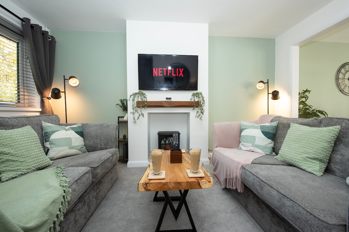 "Modernt hus med 3 sovrum på ett önskvärt läge med parkering utanför gatan för 3 bilar. Huset har ett separat vardagsrum, nyrenoverat kök med en stor ö och sittgrupp med bi-veck till den anlagda trädgården, vilket är perfekt för familjer eller grupper som söker ett hem hemifrån. Bekvämt duschrum/toalett på bottenvåningen. (Det finns en bäddsoffa i matplatsen, så kan sträcka sig till 7 "på begäran". (OBS det finns inga gardiner men du är inte förbisedd). Fråga om rabatter finns tillgängliga.