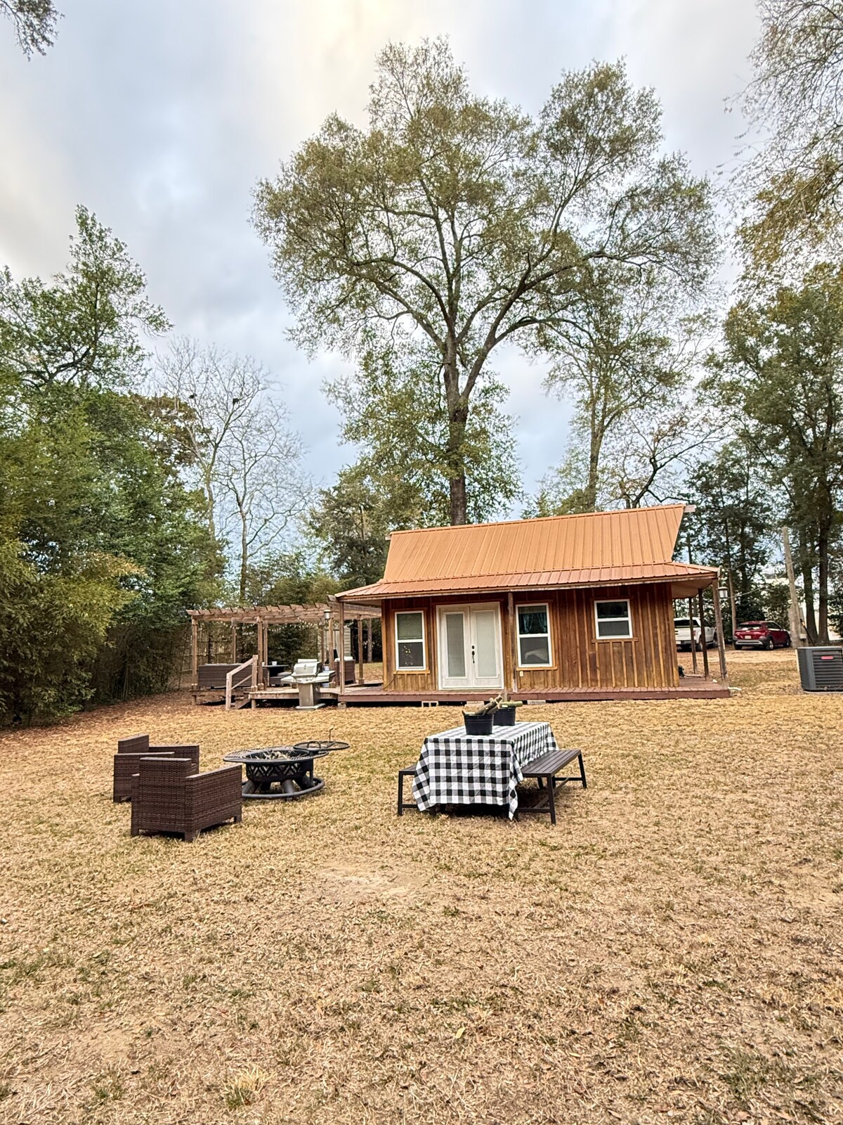 A peaceful, private cabin surrounded by trees — perfect for unwinding. Enjoy the pergola lounge, fire pit, and wide open yard for relaxing day or night.This is located between Dothan and Enterprise. We have a military member in our family and proudly welcome military guests.