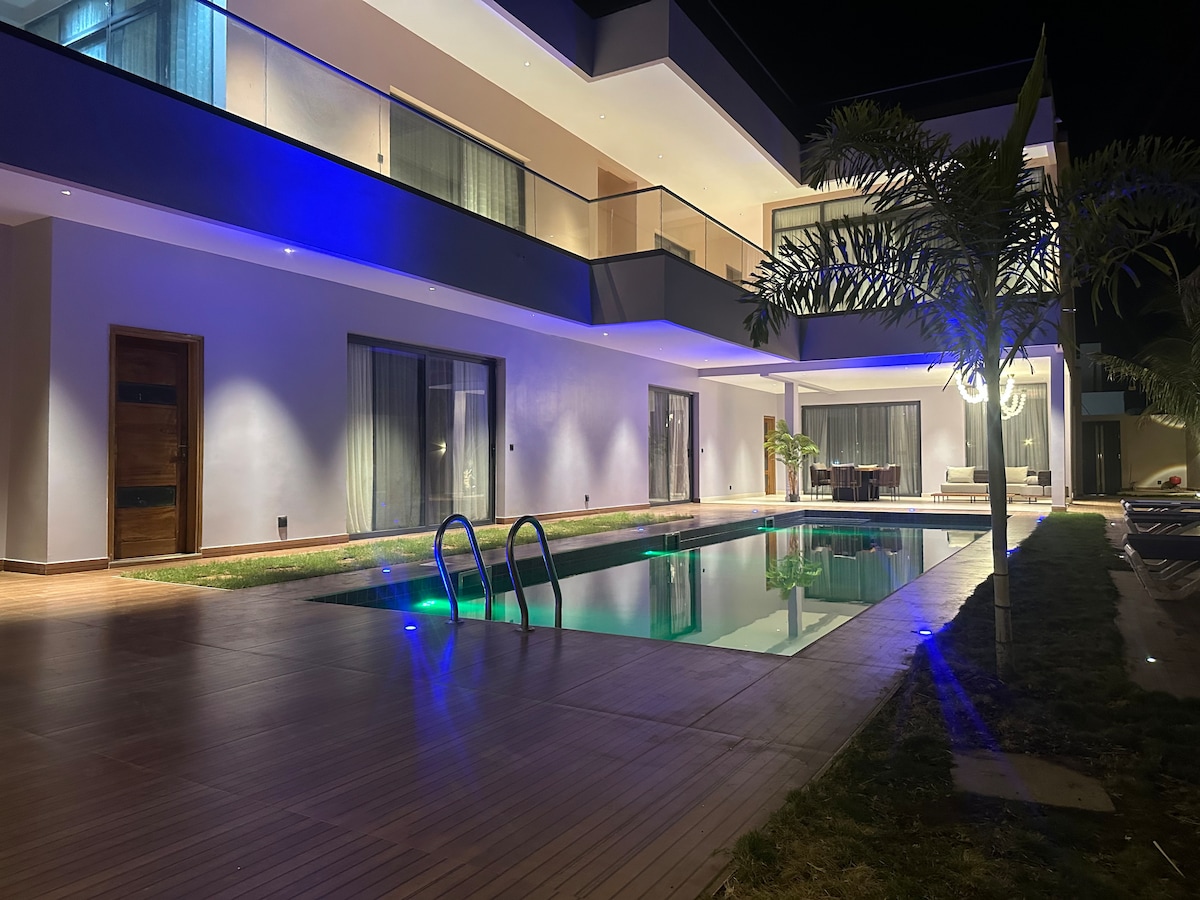 Villa belägen i en bostad med grind och säkerhet dygnet runt. Omedelbar närhet till stranden (500 m). Fullt luftkonditionerat hus med terrass och pool. Städning 6 dagar i veckan (ingår i hyran), poolunderhåll/trädgårdsmästare 6 dagar i veckan (ingår i hyran). El laddas separat och ett bidrag begärs för vatten (till självkostnadspris). Wifi tillgängligt (ingår) + Möjlighet att använda våra 4G-boxar med förbetald påfyllning. Turistskatt: 1 000 FCFA/person/dag