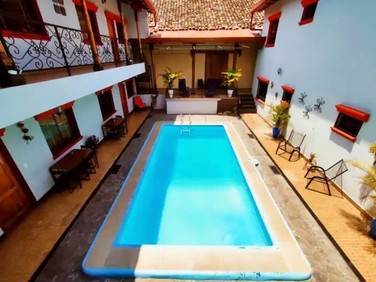 Privat lägenhet, centralt beläget i staden Granada, för 6 gäster: 3 sovrum, 2 med A/C, privata badrum, delad pool och parkering inomhus eller utanför hotellet. ★ Tre kvarter från La Merced-kyrkan och fem kvarter från Central Park. Du är också nära Pali och den kommunala marknaden. Vi samordnar följande tjänster (extra kostnad) ★ Transferservice ★ Transfer ★ Kajakturer ★ Turer på holmarna ★ Åk i en sidovagn ★ Mombacho vulkan ★ Laguna de Apoyo