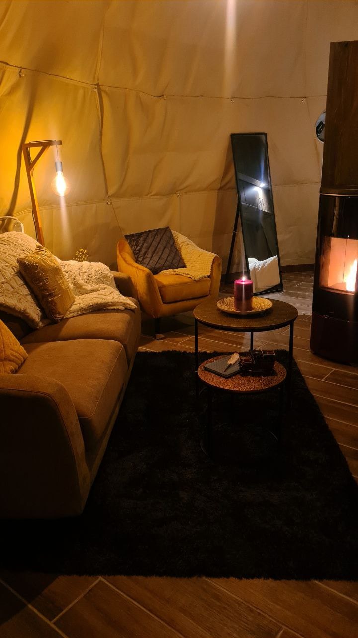 Glamor Camping med kamin, luftkonditionering och varm jacuzzi