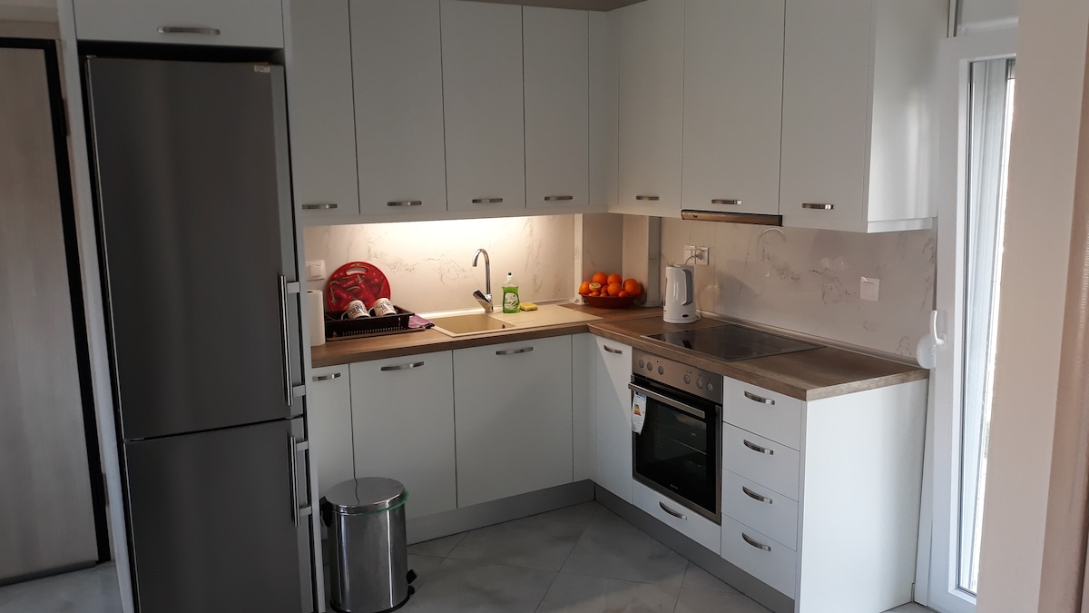 Vid havet lägenhet, med fantastisk utsikt. Lägenheten ligger i ett boendekomplex 30 meter från havet och allt du kan behöva är inom räckhåll. Det finns två sovrum, ett kök - vardagsrum och ett badrum. Det finns också en stor veranda med en fantastisk havsutsikt och en gräsyta perfekt för små barn eller för avkoppling och en sval veranda.