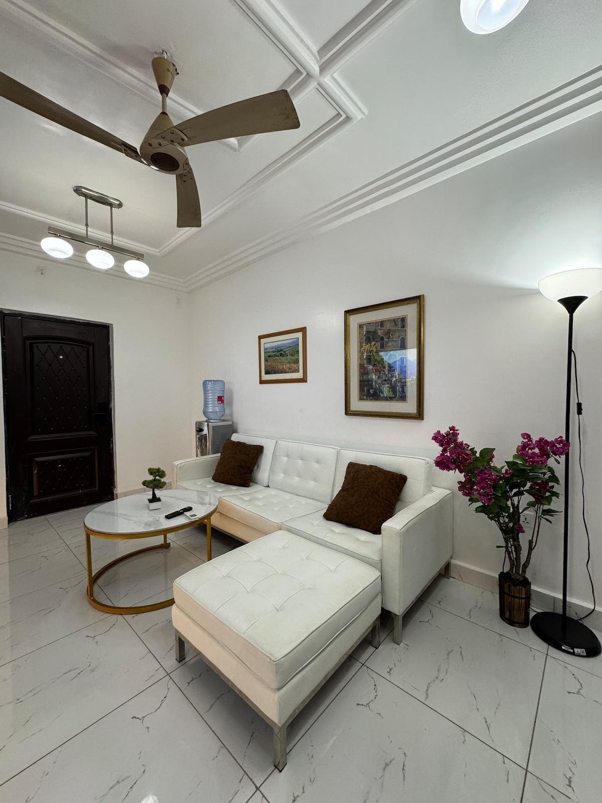 Enjoy a calm and comfortable stay in this cozy one-bedroom apartment with an en-suite bathroom, air-conditioned living room and bedroom, a fully equipped kitchen, private terrace, free parking, TVs in both rooms, and a washing machine. Located in a quiet neighborhood with easy access to shops and transport, the apartment is ideal for solo travellers and couples. A daily prepaid utility allowance of GHS 30 and 6 GB of internet are included. Any extra usage is at the guest’s expense. .