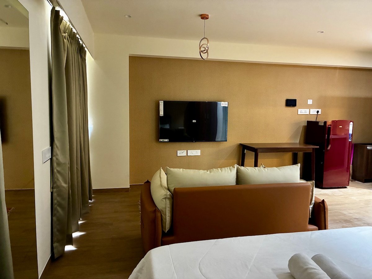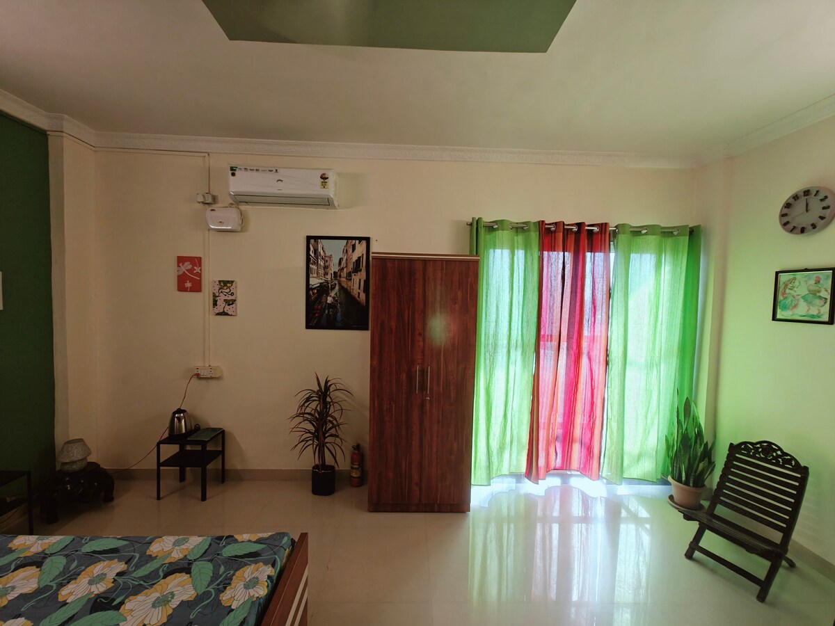 This cozy stay comes with a spacious terrace, perfect for sunset views and sky-gazing with friends. Enjoy your morning coffee or unwind at night in total peace-no disturbances, just calm vibes. Big private terrace Near the airport (super convenient!) Free covered parking on-site WiFi for work or chill (60mbps) Inverter power backup Induction&Kettle Perfect for couples, friends, family. Pet friendly Electric Vehicle charging point This space is your little slice of comfort under the open sky.