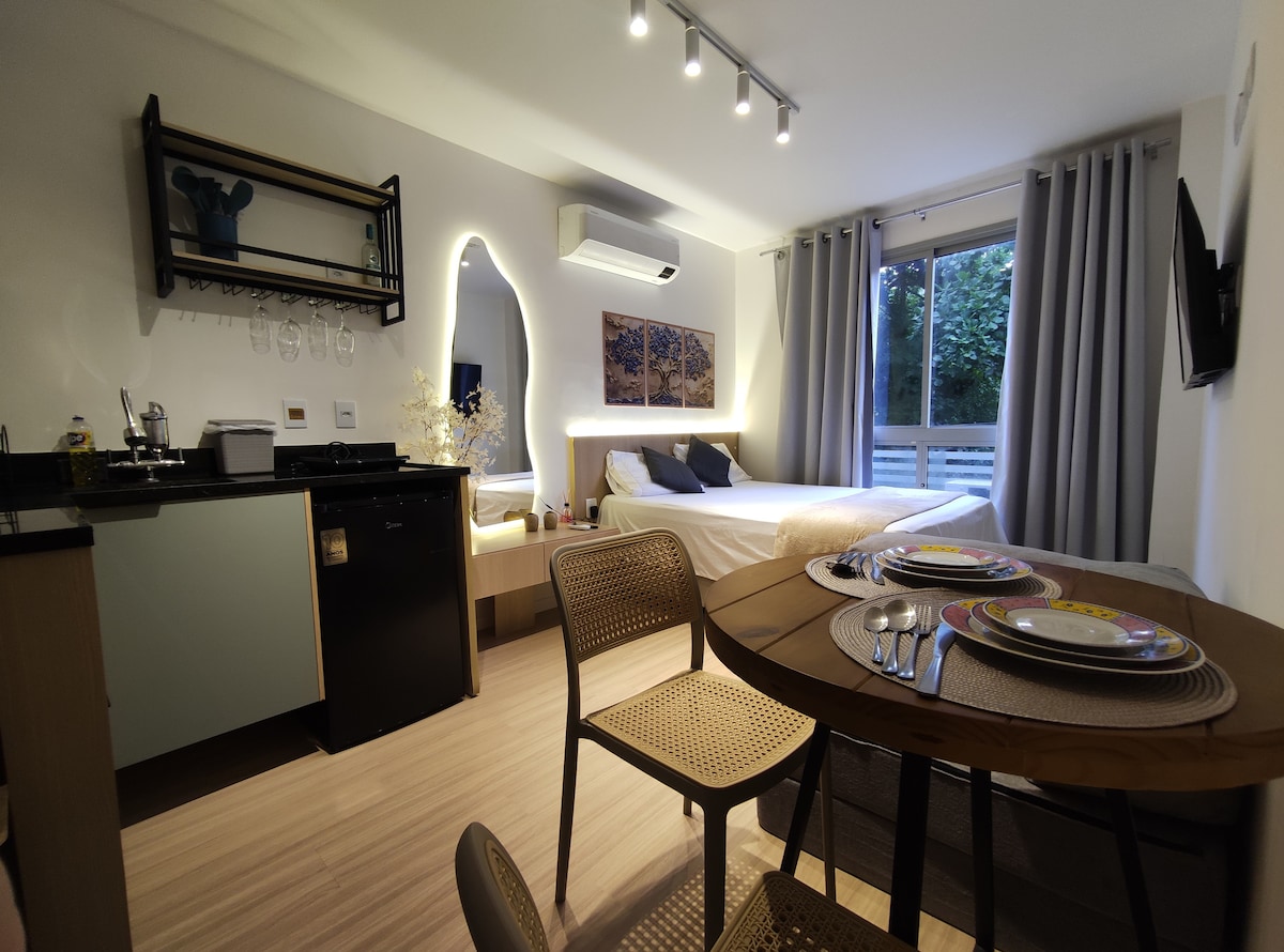 Ny, modern och komplett studio i Icaraí! Rymmer upp till 3 personer bekvämt, med en dubbelsäng och bäddsoffa. Den har en Smart TV, WiFi, luftkonditionering och ett kök utrustat med mikrovågsugn, kaffebryggare och redskap. Byggnaden erbjuder en pool, bastu, gym och cykelställ samt en 24-timmars virtuell concierge. Lugn miljö, perfekt för fritid eller arbete, med mysig inredning och enkel tillgång till stranden, barer och stadens viktigaste punkter.
