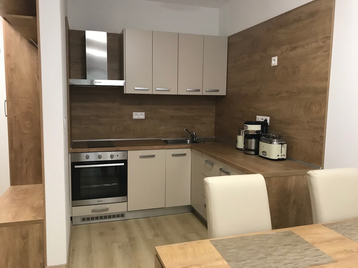Studio shelter house with an area of 33 square meters with a balcony in an extended dormitory, with a beautiful view of the Western Tatras. Rymlig, 4 meter interiör klar med lärkved. En 180x200 cm dubbelsäng med 2 enkelsängar. Pentry med diskmaskin, kylskåp, mikrovågsugn, brödrost, kaffebryggare. En 100 cm bred utdragbar fåtölj gör studion bekväm för 2 personer eller 2 personer med ett barn. Öppet utrymme bad, toalett med handfat i separat rum.