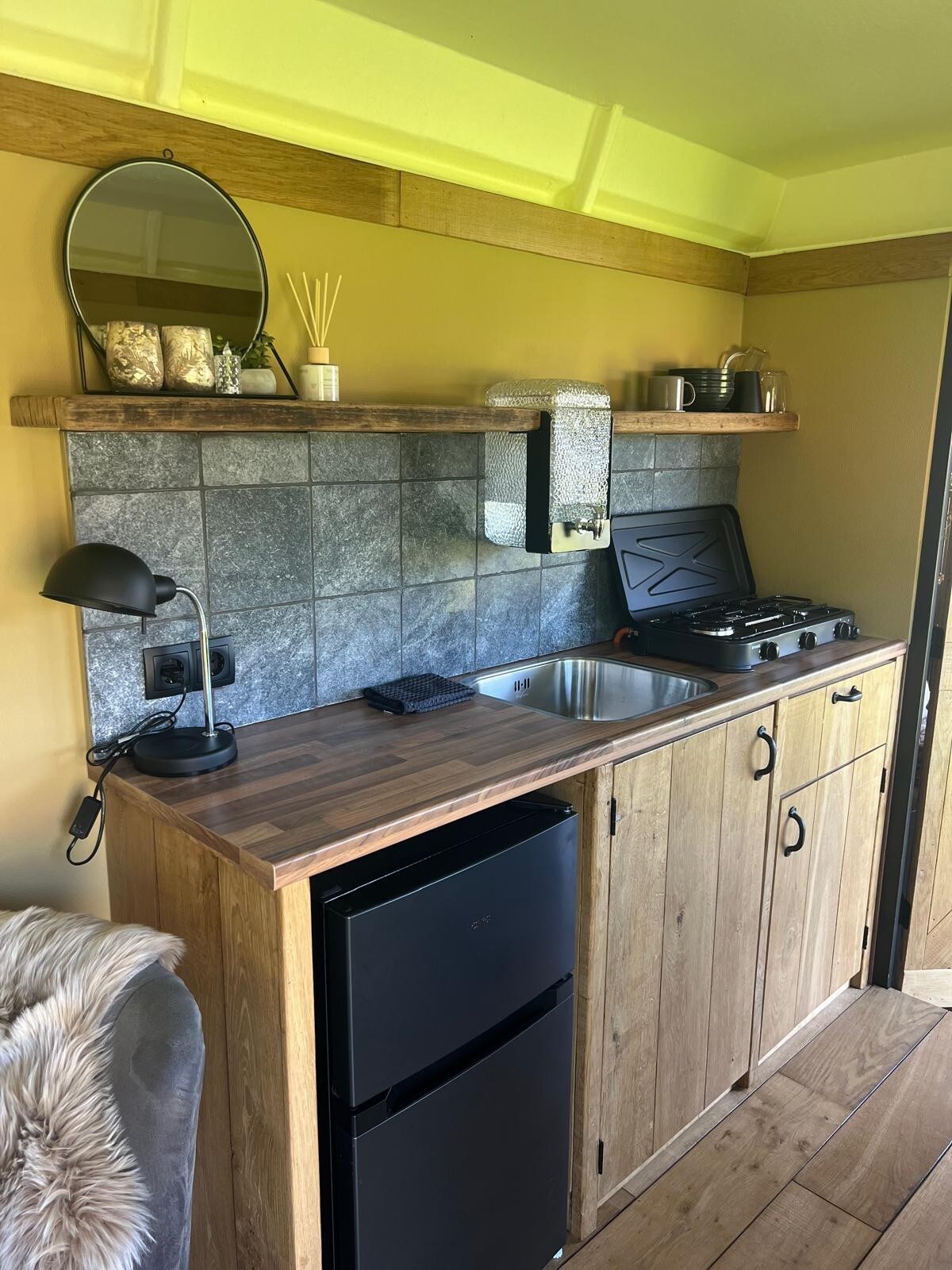 Njut av den vackra, naturliga omgivningen i detta romantiska boende. En mysig dubbelsäng med förvaringsutrymme ovanför foten. Kök med 3-brännare gästel, kyl-frys, En sittplats med 2 fåtöljer och en gasspis för de kallare dagarna. En bar som du kan få frukost eller eventuellt arbeta på. Täckt utomhusbar med utsikt över landsbygden och skogen. Badrummet är i det gamla pannhuset med duschkabin, toalett och handfat. Kort sagt, camping med lyx!