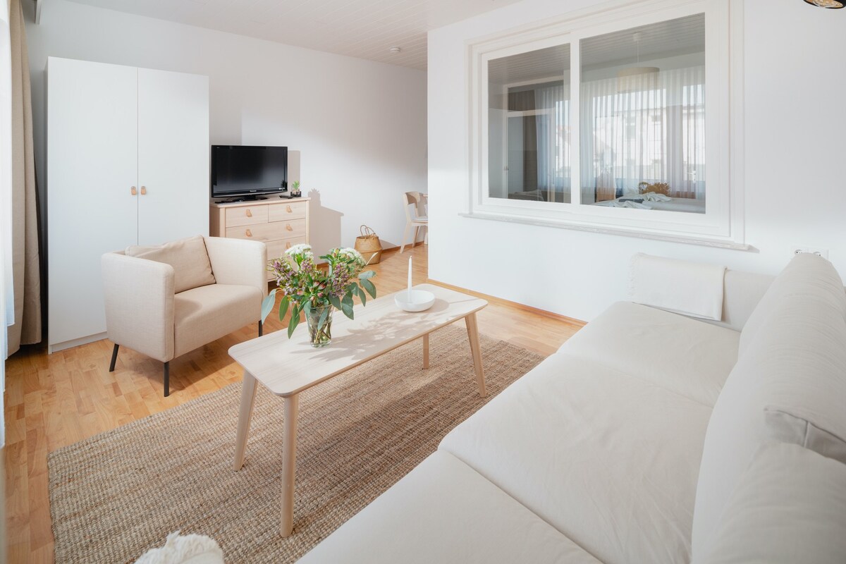 Lägenheten på bottenvåningen totalrenoverades 2020 och är utrustad med nya möbler – inklusive ett högkvalitativt kök. Rumskonceptet är extremt flexibelt. Vila och/eller arbeta mobilt (kontorsstol, 24 tums bildskärm, etc.). Fastigheten ligger vid havet och har ett av de bästa lägena på Norderney. På ca 32 m² finns en korridor, ett kök, ett badrum, ett vardagsrum med en bäddsoffa och en utdragbar 3-sits soffa.