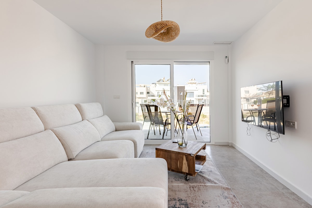 Upptäck denna lyxiga lägenhet i Hacienda del Álamo Golf Resort, Murcia. Med 3 sovrum, 2 badrum och rymliga terrasser, ett av dem med privat jacuzzi kommer du att njuta av den spanska livsstilen. Koppla av i poolerna eller spela på tennis- och padelbanorna gratis. Bara några steg från golfbanan kombinerar denna tillflyktsort modern komfort med lugn i Medelhavet. Parkering ingår. Perfekt för att uppleva solen, maten och kulturen i Spanien. Perfekt för en familjesemester eller en golfresa.