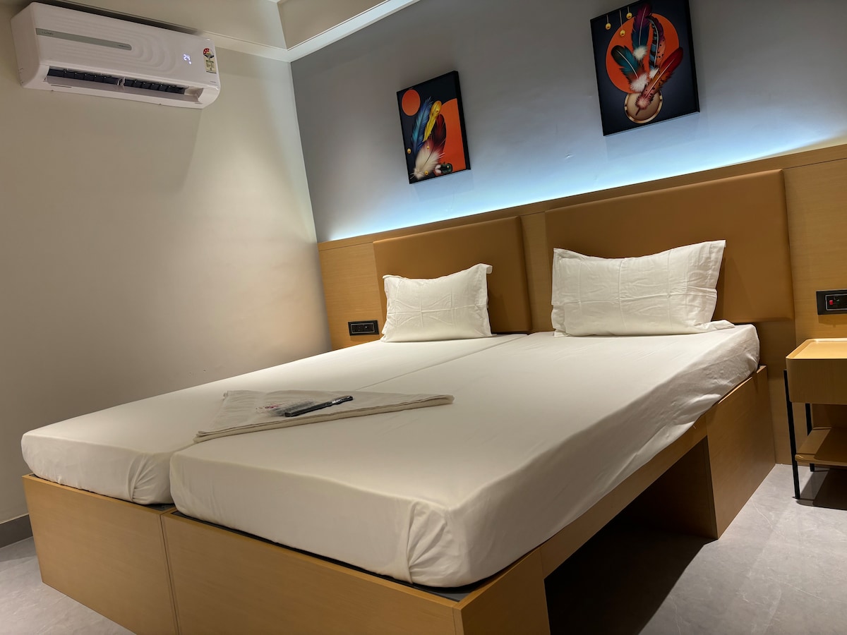 Vårt rymliga Premium Deluxe-rum har en större, välplanerad layout som är utformad för ökad komfort och avkoppling. Rummet erbjuder gott om utrymme att röra sig fritt, varva ner och njuta av en fridfull vistelse i en ren och bekväm miljö. Rummet har modern inredning, luftkonditionering, gratis Wi-Fi, en platt-TV, fräscha sängkläder och ett eget badrum. Perfekt för ensamresenärer, par och affärsresenärer som letar efter ett rymligt, förstklassigt hotellrum nära flygplatsen i Kolkata.
