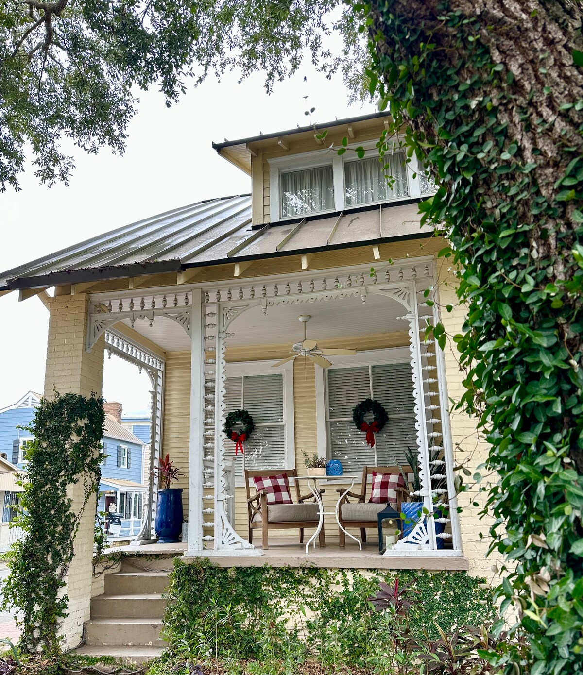 Bo direkt på Forsyth Park — inte "nära" det, men verkligen några steg bort. Gå ut genom dörren, korsa gatan, och du är omedelbart i den doftande trädgården, med den ikoniska Forsyth-fontänen bara ett kvarter bort. Cirka 1898 har denna romantiska viktorianska studio 12-fots tak, vackra hjärtfuru golv och en king size himmelssäng (Tuft & Needle) utformad för drömlika Savannah kvällar. Njut av mörkläggningsgardiner, ett fullt utrustat badrum med badkar/dusch, ett mysigt fullt utrustat kök och en liten futon för en tredje gäst.