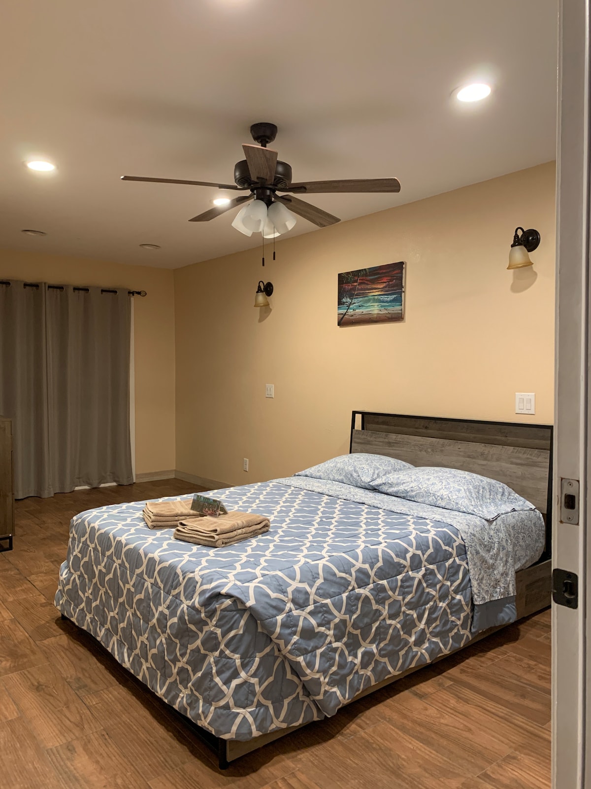 Vårt boende är ett tvåvåningshus med 1 sovrum med queen size säng, 1,5 badrum och utomhusdusch, fullt utrustat kök och vardagsrum med utdragbar queen size bäddsoffa. Kakelgolv i hela inklusive lanai w/ högt bistro-stil bord. Häng ut området under med ett litet bistrobord med 2 stolar. Helt nybyggnation, färdigställt i februari 2017. En 6 fots förlängning på lanai slutfördes 2018. Badrummet/tvättstugan på nedervåningen har uppgraderats till en fåfänga och spegel.