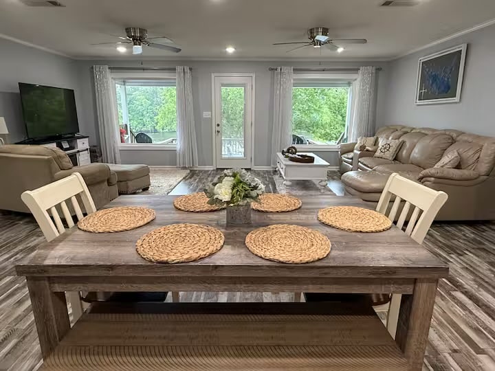 Sökandet efter det perfekta huset vid sjön är över -du har hittat det! Vad gör det så speciellt? Först finns det fantastiska utsikten över Lake Claiborne, familjevänlig layout för upp till 9 gäster. Boendet är perfekt för fiske och även bad under varmare månader och har en eldstad för att umgås under svalare månader. Det är en kort båttur till ormöen som är ett fantastiskt läge för all båtrekreation (tubing, skidåkning, etc.).
