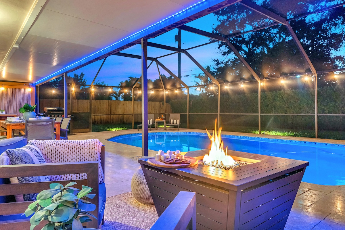 Renoverad villa med 4 sovrum nära Hallandale Beach med ny pool, bubbelpool och inhägnad bakgård. 3 rum har queensize-sängar, och det 4:e fungerar som en biograf/lekrum med fotbollsbord och bäddsoffa. Täckt cabana inkluderar fläktar, soffa, TV, öppen spis, grill, solstolar och jacuzzi. Inuti: fullt utrustat kök, öppen spis inomhus, arbetsyta, Wi-Fi och streaming. Parkering på plats, tvättstuga och husdjursvänlig extra avgift. Nära Aventura Mall, Gulfstream Park, Hard Rock Casino och Hollywood Beach Boardwalk.
