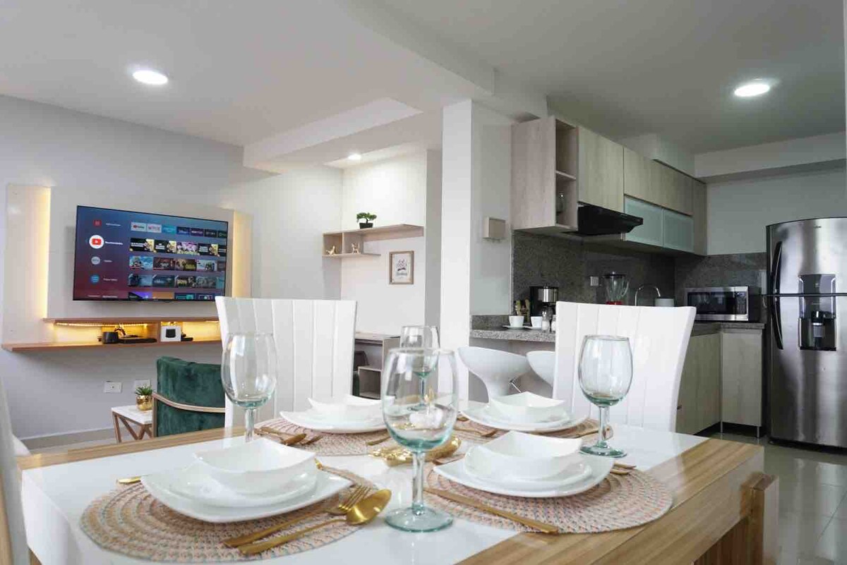 Fullt möblerad lägenhet. Den har luftkonditionering i hela lägenheten. Det ligger på det bästa läget i Cúcuta. Nära Exito, D1, Makro Homecenter, Ventura Plaza köpcentrum. Du hittar 3 min exklusiva restauranger, nattklubbar, malecon och centrum. Det ligger i en privat lägenhet som har en pool, gym, grill, terrass med panoramautsikt, barnpark och privat parkering. Utrustad med WiFi, TV, Netflix. 15 min från flygplatsen