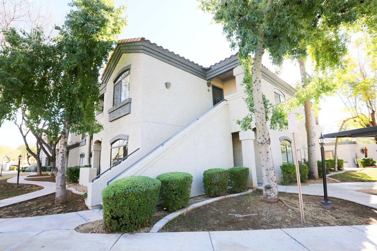 Välkommen till din eleganta lägenhet på första våningen i North Scottsdales eftertraktade grannskap! Detta kurerade utrymme blandar sydvästlig charm med moderna uppdateringar. Du är bara några minuter från golfbanor, de bästa vandringslederna och snabb tillgång till motorvägen. Bredvid en uppvärmd pool, jacuzzi och gym. Täckt parkering finns precis utanför din dörr. Promenera till mataffärer, butiker, restauranger, parker och pickleballbanor. Dessutom enkel tillgång till Mayo Clinic och WestWorld i närheten! Uppmärksamma värdar är alltid redo att hjälpa till.