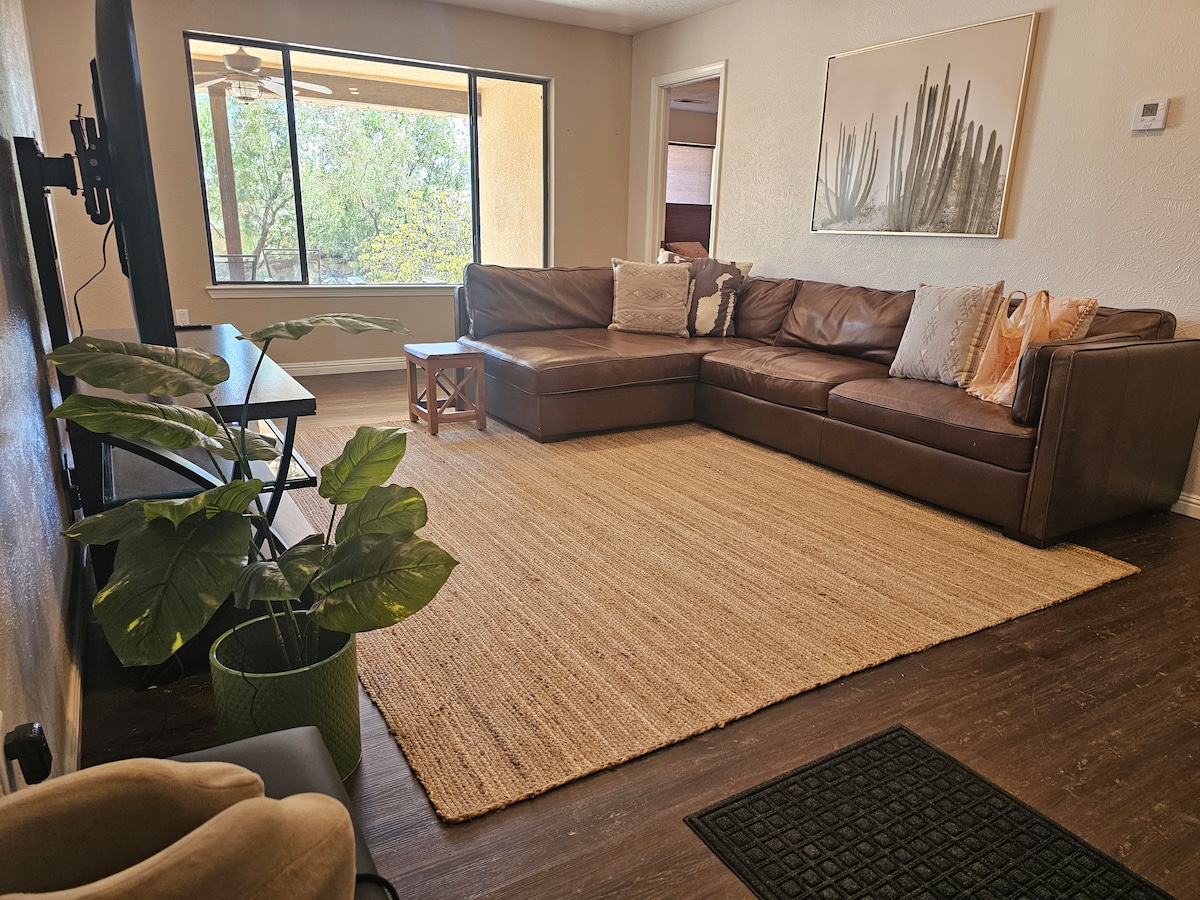 Kom och koppla av. Njut av popcorn med hela familjen medan ni tittar på Netflix i detta fridfulla boende. Familjevänligt/djurvänligt och lugnt område, 10 minuter från Sandia Peak, enkel tillgång till I-40, bergsvandringsleder i Uptown-området, Icon-biografen, park och mycket mer. Med en stor inhägnad bakgård, ny luftkonditionering/värmare. Vårt hus har även ett garage för en bil och är utformat för att ge dig en bekväm och avkopplande vistelse.