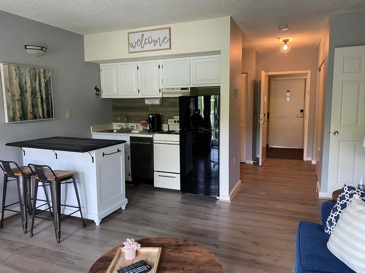 ***Vi följer CDC:s säkerhetsriktlinjer gällande Covid-19*** Denna lägenhet ligger i en Deer Park resort som ligger framför en privat sjö och har spektakulär utsikt över sjön och Loon bergsskidbackar. Det krävs bara två steg för att komma in i lägenheten — nästan inga steg! Du kan göra massor av aktiviteter inom semesterorten, cykla, gå, simma, fiska och massor av fler och närliggande städer ligger på gångavstånd.