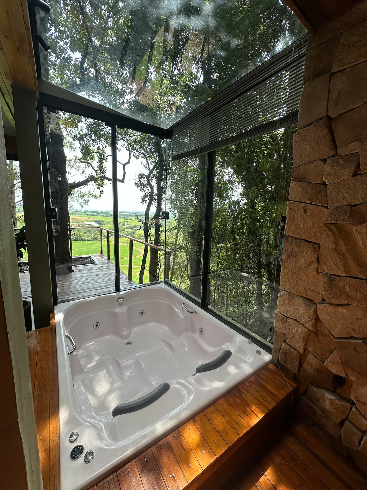 Exklusiv stuga mitt i skogen, med otrolig utsikt över dalen och oförglömlig solnedgång. Den stora skillnaden är bubbelpoolen med panoramautsikt, omgiven av glas, i en helt privat miljö. Den har en stor altan, grill och hängmatta. Stugan är 100 % luftkonditionerad, har kök med grundläggande föremål och sovrum på övervåningen med härlig utsikt. Perfekt för dem som söker komfort, natur och total avskildhet.