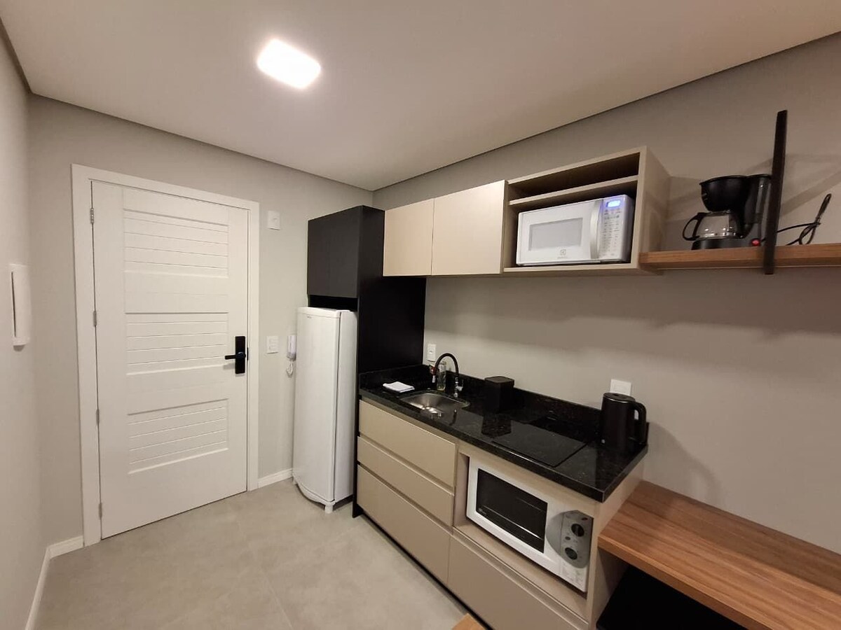 Modern Studio | Near Feevale – NH Fully equipped, highly functional studio—perfect for studying, working, or enjoying the city. Open-plan layout with double box bed, sofa, TV, and integrated home office. American kitchen with cooktop, microwave, fridge, and multifunctional counter—ideal for quick meals or studying. Building features an open-air lounge, eco-friendly fireplace, chimarródromo, gym, bike storage, and pet area.
