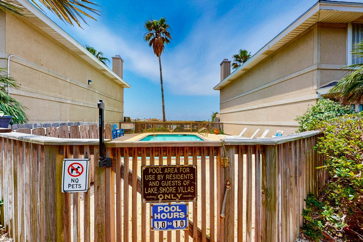 Ta din baddräkt och lite solkräm för en tillflyktsort vid Gulf Coast till denna lägenhet med 2 sängar och 2 badrum. Denna bekväma tillflyktsort har färgglad kustinredning, en våt bar, ett privat däck med utsikt över den gemensamma poolen och ett fullt utrustat kök. Tillbringa dina dagar med att koppla av vid poolen, spela i spelrummet eller promenera längs Mustang Island Beach. Med restauranger och shopping i Port Aransas eller dagsutflykter över till Corpus Christi har du och din lurviga vän alltid ett annat äventyr!