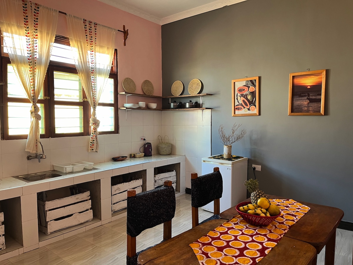 Ett härligt familjehus omgivet av vacker trädgård med massor av växter och träd. I hjärtat av Nungwis lokala by. Detta är en plats som gör dig avslappnad. Det är alltid bra att mingla med lokalbefolkningen och detta är rätt ställe. Huset är afrikansk stil, rymligt, med en stor möblerad uteplats, kök, två dubbelsängar rum, ett stort vardagsrum (med mer en dubbelsäng) och badrum.
