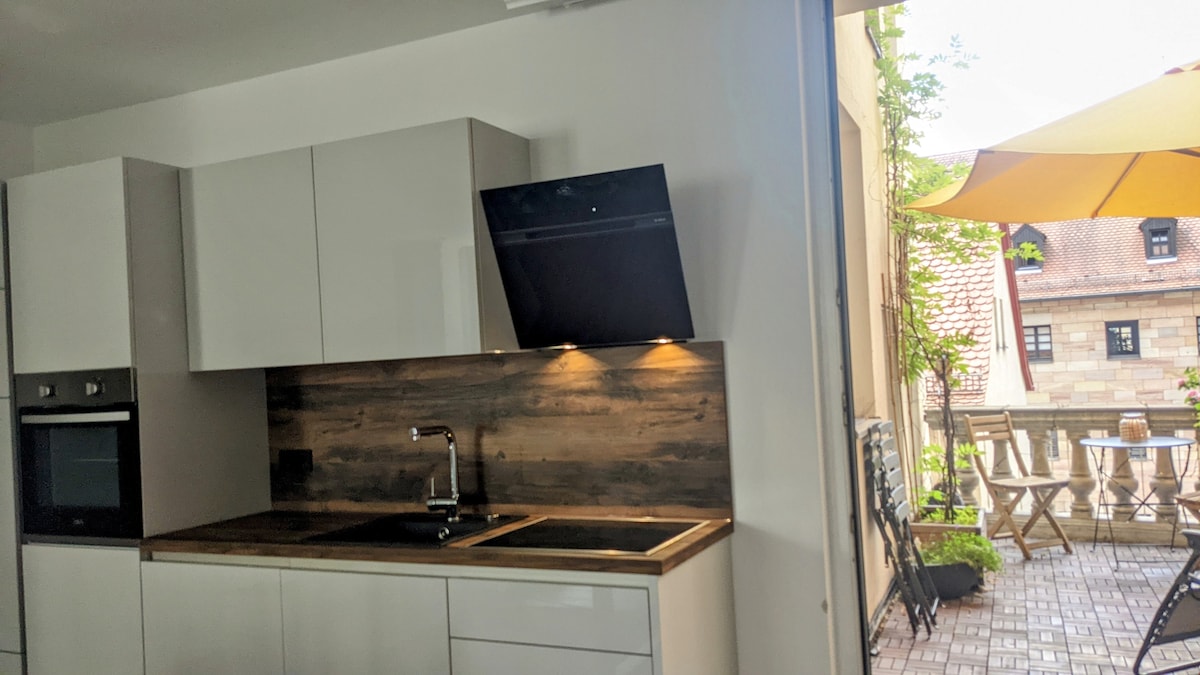 Du bor i denna eleganta lägenhet i ett centralt läge (Nürnberg, St. Sebald). Lägenheten har ett eget sovrum, en bäddsoffa i vardagsrummet och ett badrum med dusch. Höjdpunkten är verkligen terrassen med utsikt mot innergården. Plats Du befinner dig mitt i Gamla stan och ändå på en lugn sidogata. Lägenheten är lätt att nå med bil och kollektivtrafik. På några minuter är du direkt på huvudmarknaden och alla viktiga sevärdheter.