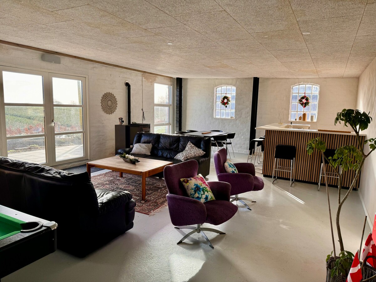 Gården är för dem som behöver koppla av i lugna omgivningar. Du kommer att vara omgiven av idyllisk dansk landsbygd, med tillgång till stranden. Gården är renoverad till högsta standard, med 7 rum med plats för upp till 14 vuxna, och dessutom finns det sängar för 4 barn. För de små finns det 2 resesängar. Den stora attraktionen är vår aktivitetshall där vi just har installerat en professionell pickle ball bana. Dessutom finns även ett bordtennisbord. I loungen finns en biograf och biljardbord.